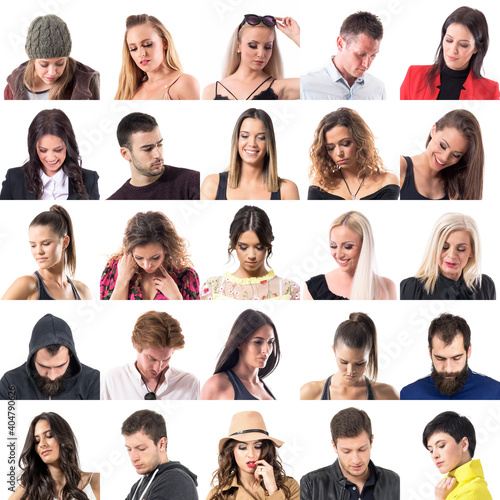 Collage of many various people looking down below portraits isolated on white background.