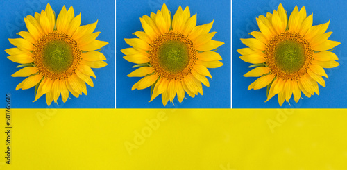 Collage of sunflower on the colored background. Copy space.