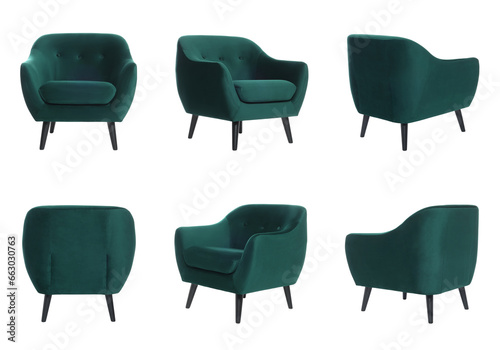 Collage with comfortable armchair isolated on white, different sides