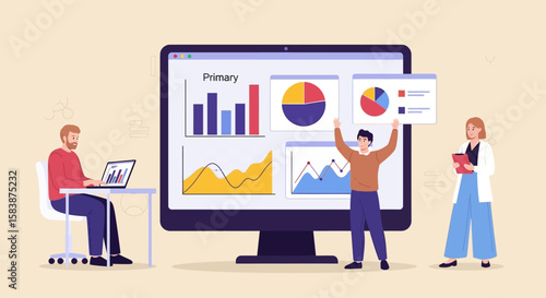 Colleagues collaborating on a business intelligence report, analyzing data on a large interactive dashboard with charts.
