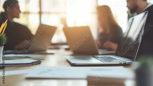 Colleagues gathered in a minimalist office, brainstorming ideas. Featuring collaboration and teamwork