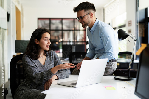 Colleagues in office. Businesswoman and businessman discussing work in office.