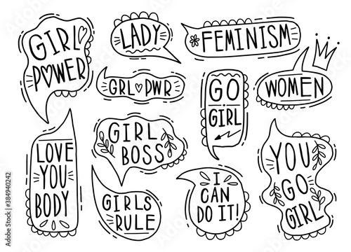 Collection hand drawn communicate feminism speech. Design element slogan doodle business message.