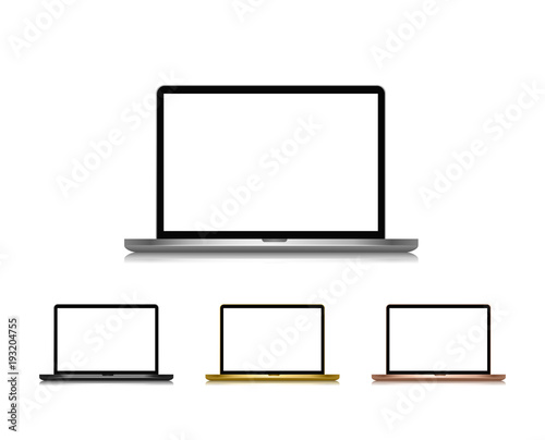 Collection isolated laptops with colorful covering vector illustration. Opened personal computer template with white screen on light background