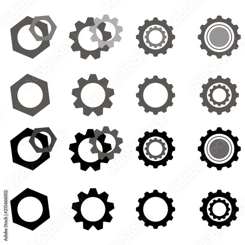 Collection of 16 gear wheels isolated on light background. Gear vector icon.