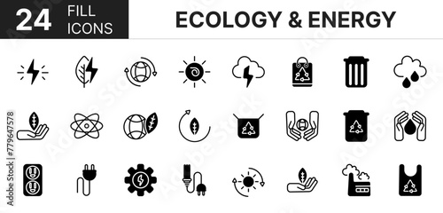 Collection of 24 ecology & energy fill icons featuring editable strokes. These outline icons depict various modes of ecology & energy, sustainable, battery, ray, line,