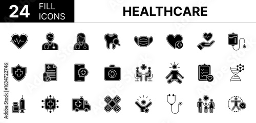 Collection of 24 Healthcare fill icons featuring editable strokes. These outline icons depict various modes of Healthcare, Health, care, medicine, hospital, health, wellness,