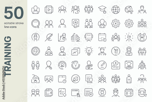 Collection of 50 editable stroke line icons for training and business concepts isolated on white background