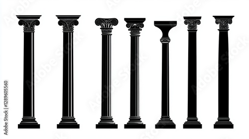 Collection of ancient Greek column silhouettes in black and white. These classic architectural elements, including pillars and pedestals, are from classical Roman architecture.