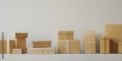 Collection of assorted brown cardboard boxes arranged neatly on a clean white surface against a light gray wall background for packaging concepts