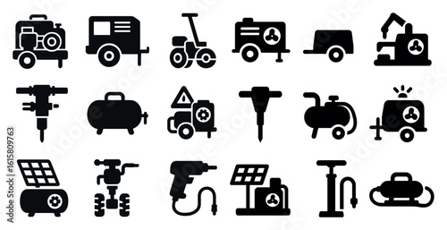 Collection of black and white icons for various tools and equipment. The icons include a hammer, a wrench, a drill, a gas tank, and a tire