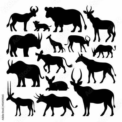 Collection of black animal silhouettes featuring a variety of wild and savanna species—elephants, giraffes, rhinos, antelopes, birds, and more—arranged on a white background in a compact grid layout.