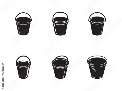 Collection of Black Bucket Icons in Various Styles Isolated on White Background for Design and Illustration Purposes Showcasing Clean and Simple Imagery