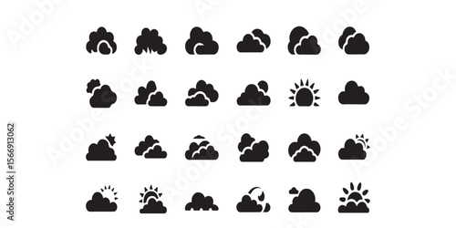Collection of black cloud and sun icons arranged in a grid on a white background graphic resource