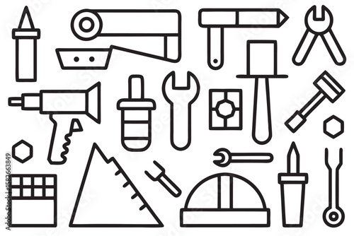 Collection of Black Line Art Icons Representing Various Tools and Objects on a White Background construction