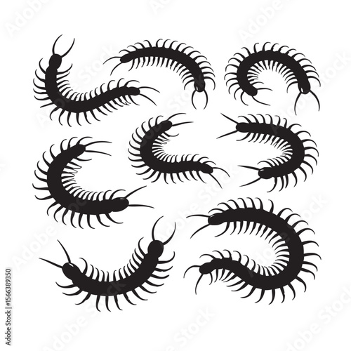 Collection of black silhouette centipedes with many legs and antennae on white background