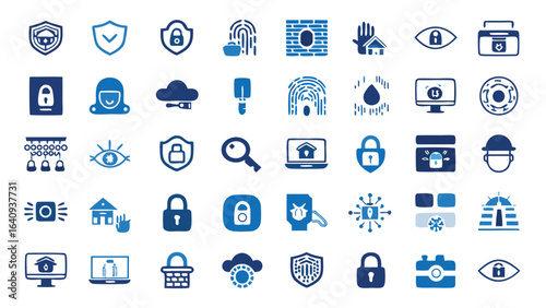 Collection of blue security icons representing various safety and protection measures for digital and physical assets