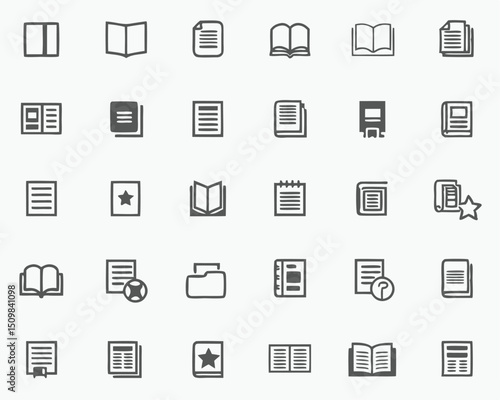Collection of book and document icons for library, education, and office use in simple line art style