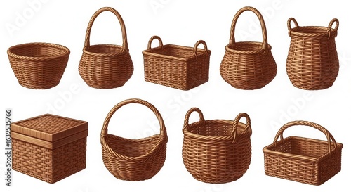 Collection of brown wicker baskets in various shapes isolated on a white background