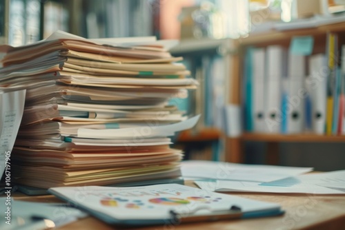 Collection of business analytics charts and graphs stacked on each other on paper on desk in office