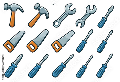 Collection of cartoon hand tools with hammers, wrenches, saws, and screwdrivers