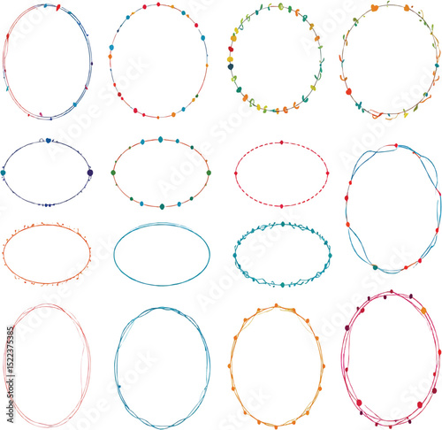 Collection of colorful hand drawn doodle frames and wreaths on a transparent background