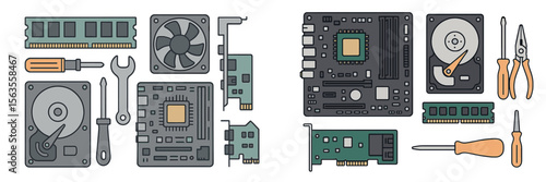 Collection of computer hardware components laid out for assembly or repair in a workshop setting