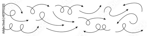 Collection of curved arrows. Set simple curved hand drawn arrows. Collection of pointers.
