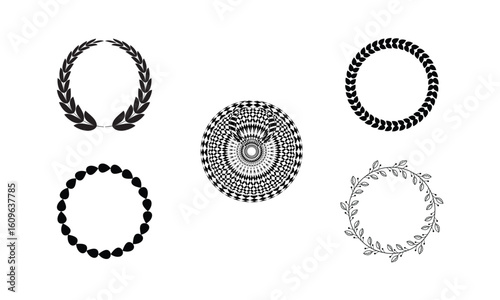 Collection of Decorative Circular Frame Designs – Abstract and Floral Laurel Wreaths and Optical Illusion Patterns in Black and White for Badges, Emblems, and Logo Elements