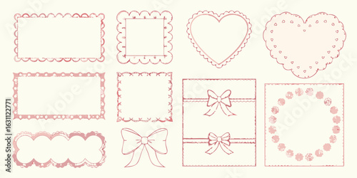 Collection of decorative hand drawn pink frames and borders with hearts and bows