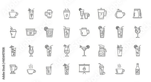Collection of diverse beverage icons, from coffee to cocktails, presented in a clean, modern outline style.