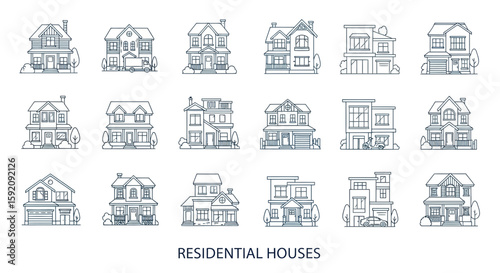 Collection of fifteen different residential house designs in a line art style, showcasing various architectural styles and layouts.