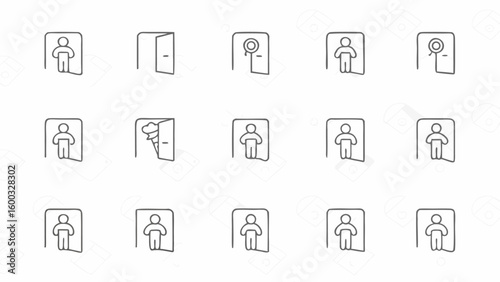Collection of fifteen simple line icons depicting people entering and exiting through various types of doors silhouette