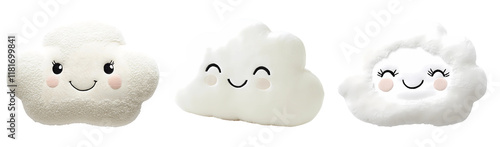 Collection of fluffy cloud-shaped pillow toy with embroidered smiling eyes, positioned on a pure white or transparent background.