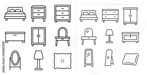 Collection of furniture items, including a bed, dresser, chair, and lamp. Concept of organization and order, with each piece of furniture neatly arranged and labeled. The use of a black