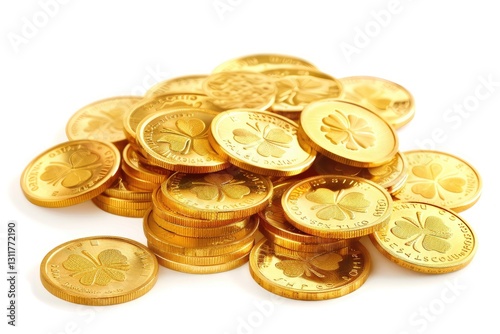 Collection of gold coins isolated on white background, symbolizing St. Patrick’s Day luck, prosperity, and good fortune.