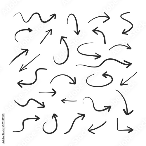 Collection of hand drawn doodle style arrows in various directions. Black arrows isolated on white background
