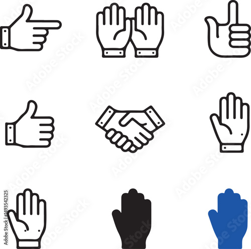 Collection of hand gestures and icons in modern flat design black and white style illustrating various symbols and actions