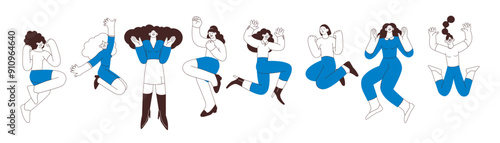 Collection of happy business employee females jumping in the air cheerfully isolated on white background. Black and white modern flat vector illustration. Social media concept.