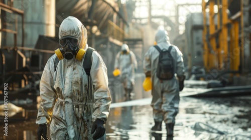 Collection of Hazardous Waste, A scene showing workers in protective gear collecting hazardous waste from an industrial site, emphasizing safety measures and the dangerous nature of the waste.
