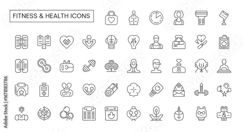 Collection of health and fitness symbols displayed on white representing wellness, exercise, and healthy lifestyle in a clean, minimalist style.
