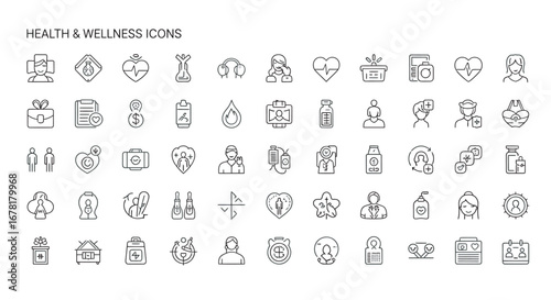 Collection of health and wellness symbols displayed on white backdrop representing healthcare and healthy lifestyle with minimalist aesthetic.