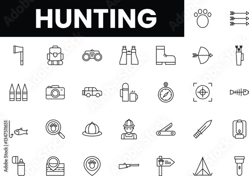 Collection of hunting icons featuring tools and gear in a minimalist design.
