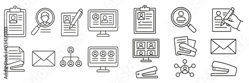 Collection of icons representing employment recruitment, job applications, and professional documentation processes in a minimalistic style