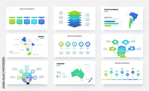 Collection of infographic presentation slides with human head, maps, circles and other diagrams. Flat vector illustration for business analysis