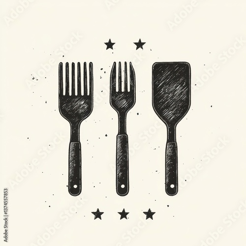Collection of kitchen utensils featuring two forks and a spatula arranged with decorative stars in a simple design
