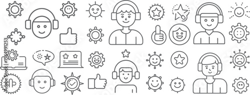 Collection of line art icons representing customer service feedback and positive experiences with smiling faces and gears