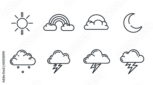 Collection of line-art weather icons, including sun, rainbow, moon, clouds, rain, and lightning