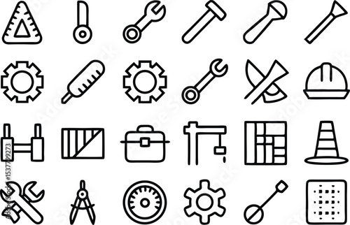 Collection of mechanical engineering outline icons and tools isolated on transparent background
