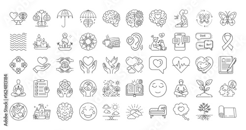 Collection of mental health and wellbeing icons in outline style, conceptual design